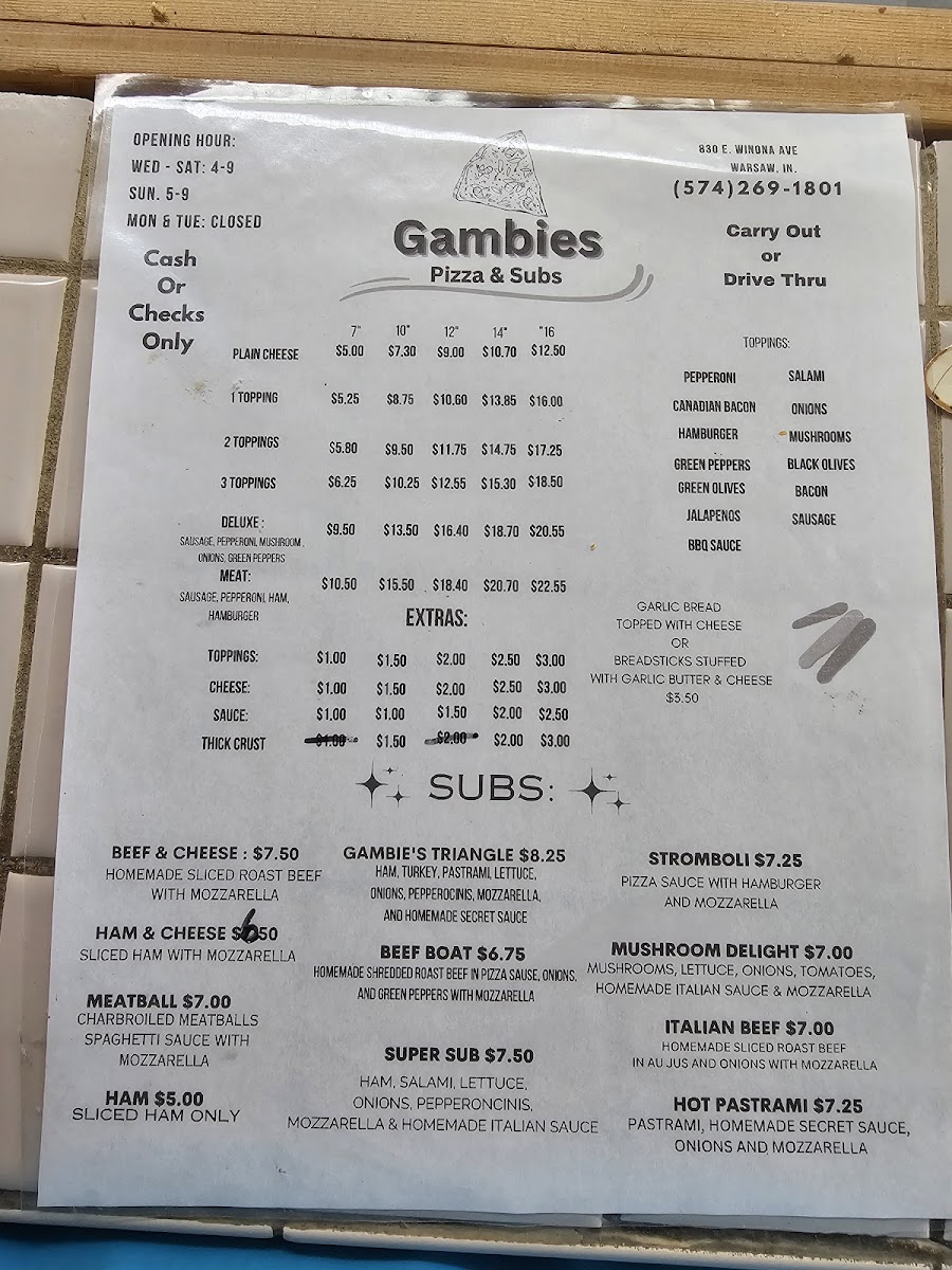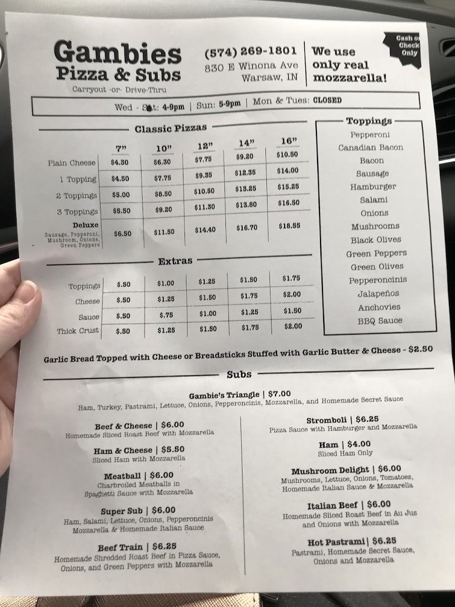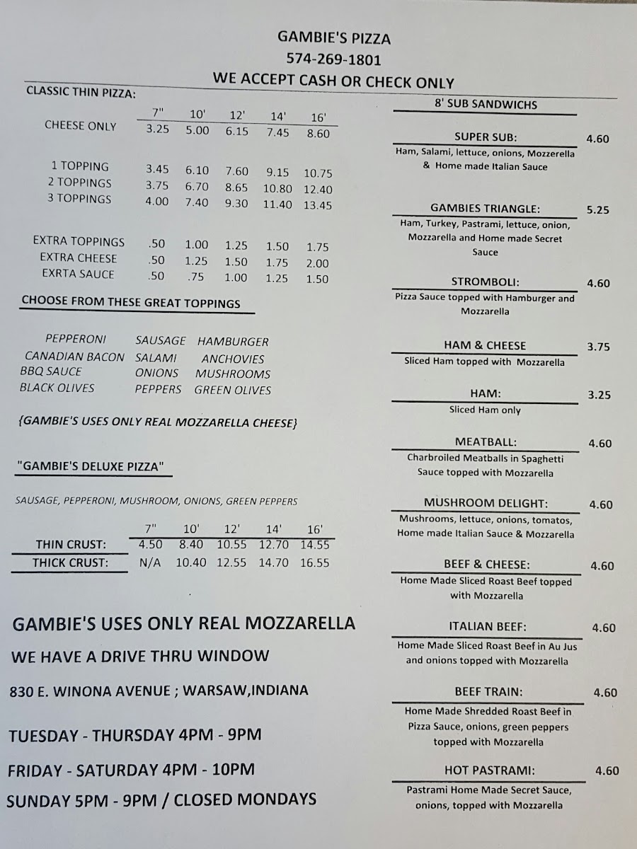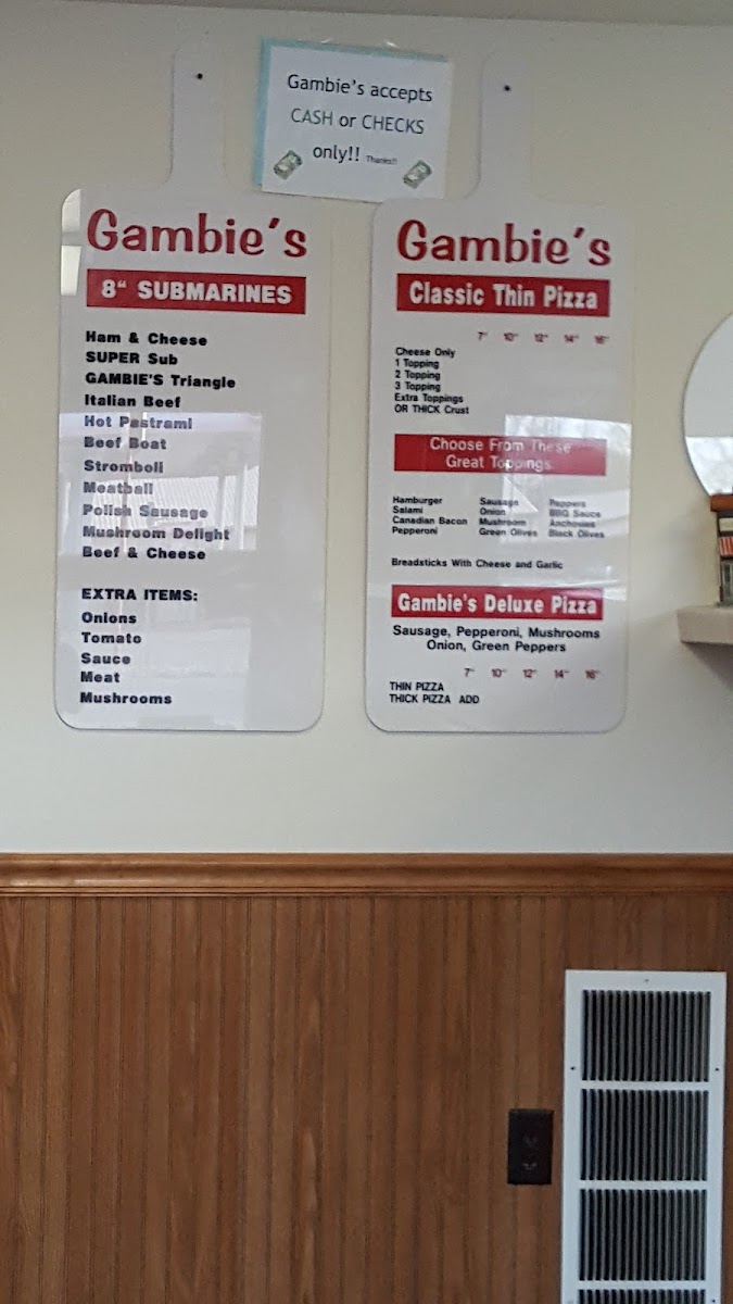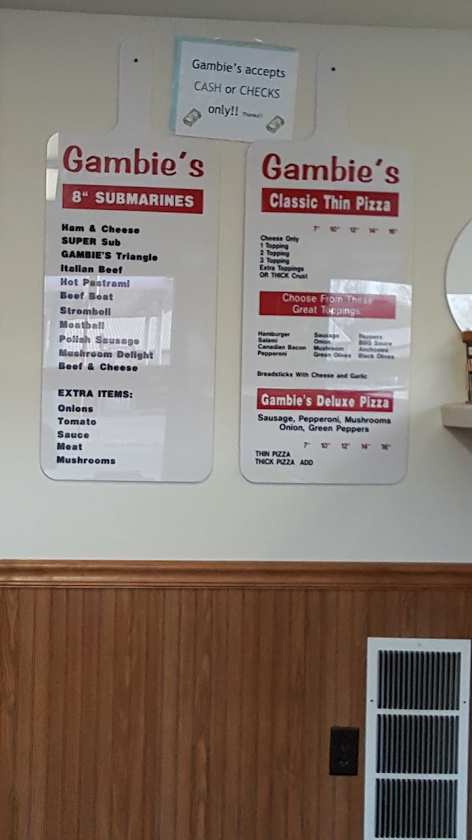 Wrapping up a meal at Gambie's Pizza, you’ll be struck by the straightforward, classic American‑Italian menu that revolves around hearty pizzas and satisfying subs. Reviewers often highlight the Subs lineup featuring classics like Ham & Cheese and Beef & Cheese, along with the signature MeatballHam and the distinct Gambie's Triangle-all offering simple, savory fillings that pair well with a soda or side. The Classic Pizzas section sticks to timeless favorites such as Plain Cheese, 1 Topping, and the more loaded Deluxe, letting you choose from basic comfort to a more indulgent slice. Sandwich lovers also enjoy the 8' Sub Sandwiches like the generous Super Sub, a second take on the familiar Gambie's Triangle, as well as StromboliHam & Cheese and Meatball options, which bring warmth and hearty portions to the table. While exact prices aren’t always listed across menus, the emphasis remains on affordability and satisfying portions that locals keep coming back for-an unpretentious menu that highlights familiar names and comforting flavors that define this Warsaw staple.